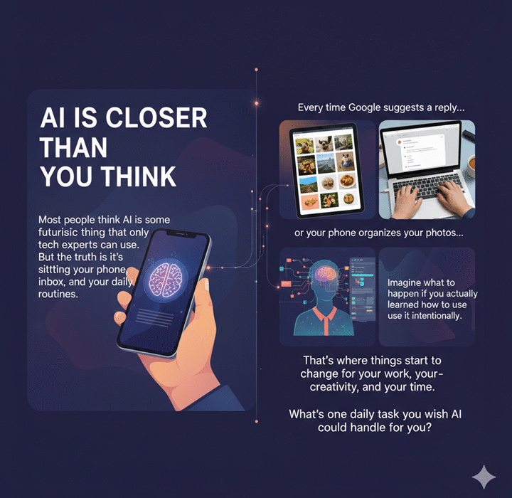 Most people think AI is some futuristic thing that only tech experts can use. But the truth is, it’s already sitting in your phone, your inbox, and your daily routines. Every time Google suggests a reply, or your phone organizes your photos, that’s AI quietly working for you. Imagine what [...]